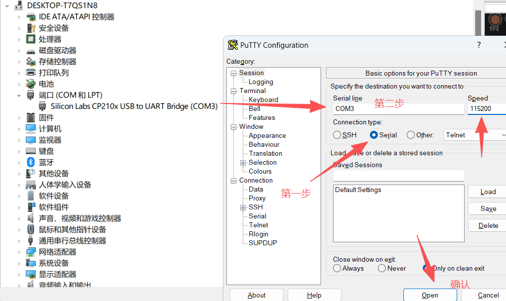PC打开PuTTY,选择连接方式为Serial,将端口号改为系统识别到的端口号,Speed从9600修改为115200,然后连接。