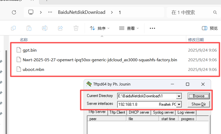 启动tftpd64,将Current Directory目录修改为固件存放目录,Server interfaces修改为192.168.1.X的网卡。