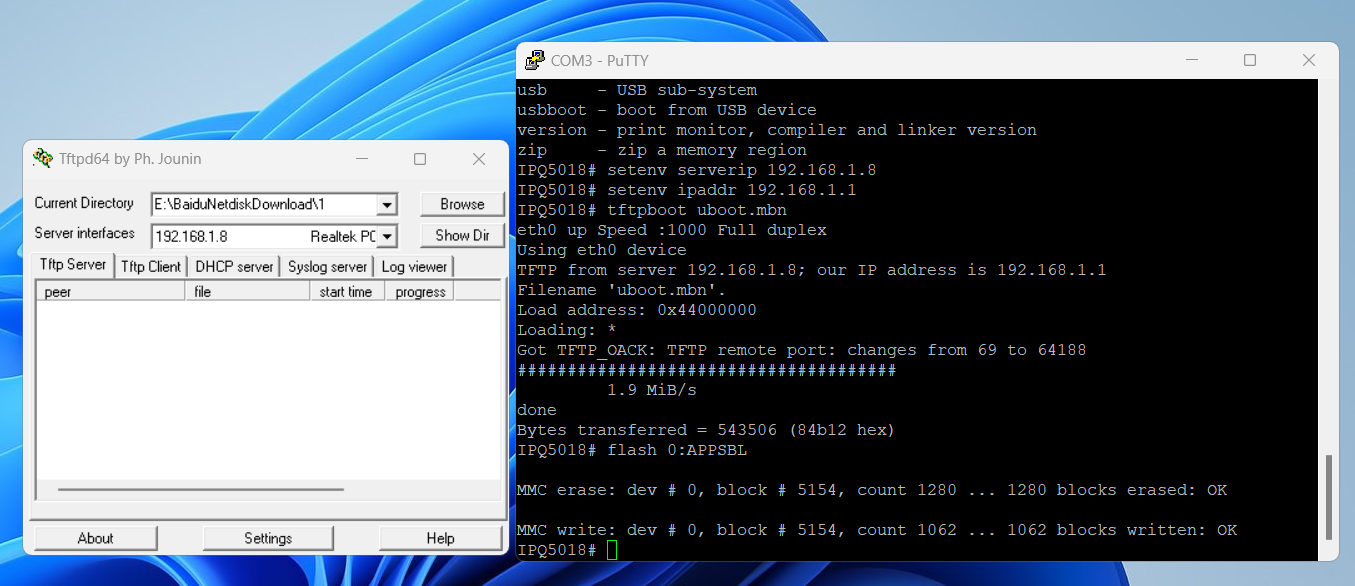 *技巧:先复制jdqca然后通电后立即在PuTTY的窗口中右键即可。PuTTY中出现IPQ5018#即算成功。