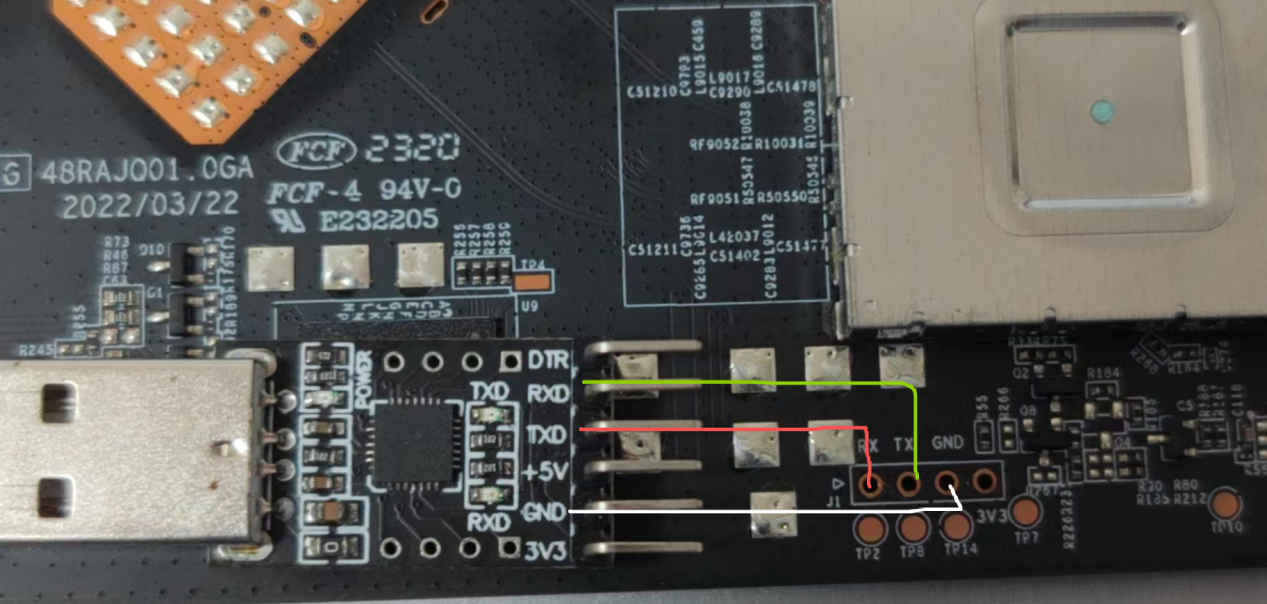 拆机后使用CP2102接入串口,其中TX连接RX、RX连接TX,GND连接GND,其余无需连接。